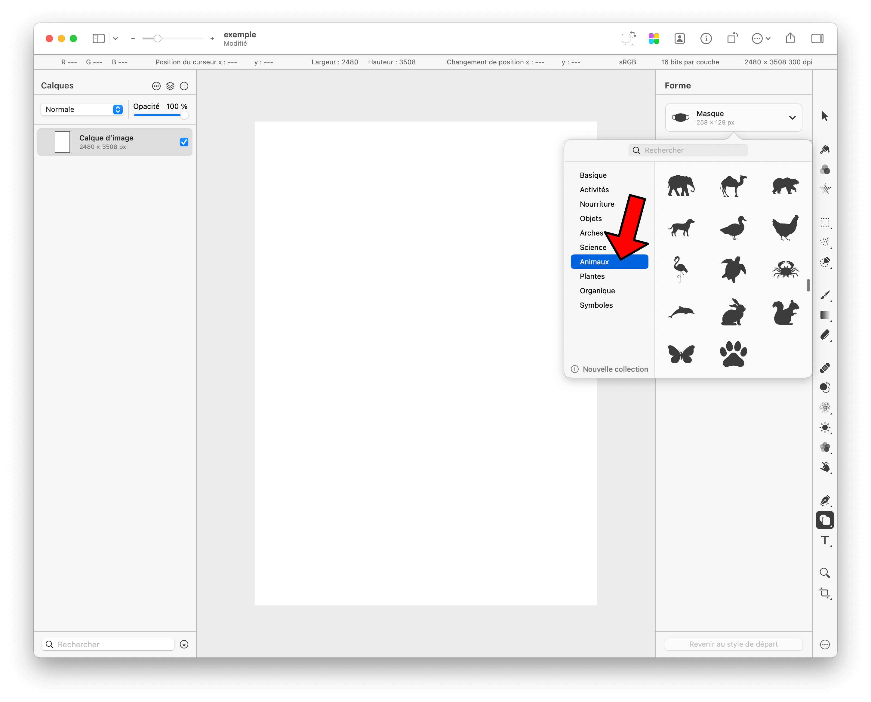 Créer un rectangle dans Pixelmator Pro est très simple. Il suffit d’aller dans la section forme dans les options, de sélectionner la bonne forme et de dessiner celle-ci sur le support au centre.